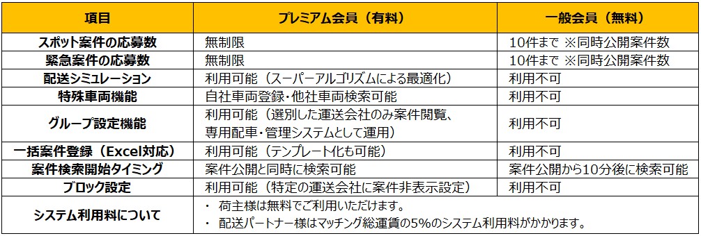 荷主様はWeb上から案件を簡単に登録・発注でき、配送パートナー様は空車情報を元に最適な案件を獲得可能です。初期費用・月額費用は不要で、成約時に(配送パートナー様のみ)手数料が発生する明瞭な料金体系となっております。